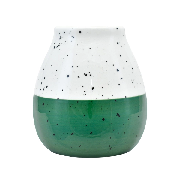 Керамічний калабаш "Папагайо" - зручна, добротна калабашка для мате місткістю приблизно 300-350 мл. Форма калабаша натхненна традиційними південноамериканськими калабашами. Глазурований зсередини та зовні. Покритий світлою глазур'ю та прикрашений чорними візерунками з нерегулярними цяточками. Має стильне зрізане дно зеленого кольору. Дизайнерський стаканчик для мате чудово доповнить екіпіровку кожного матеїста!