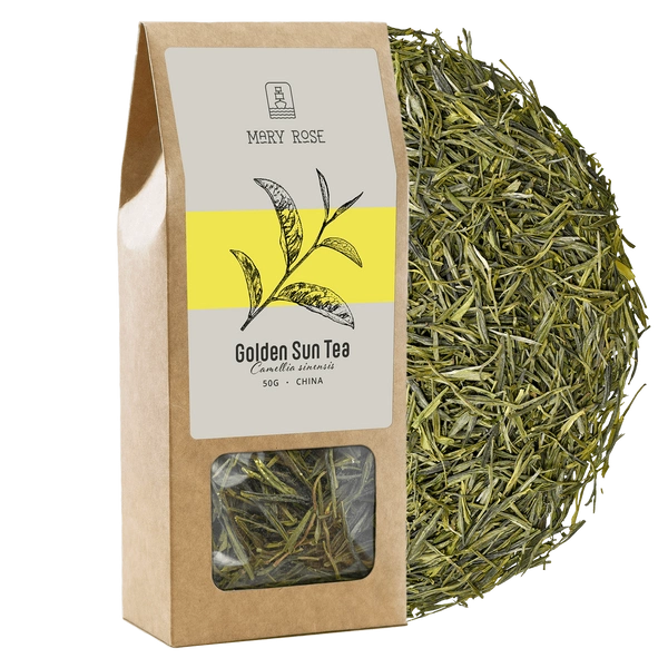 Mary Rose Золоте Сонце - жовтий чай сорту "Жовті Бутони", що походить з китайської провінції Аньхой. Це один з найрідкісніших сортів серед усіх чаїв. Його ще називають "імператорським чаєм", що відсилає до деяких китайських легенд. Кажуть, що багато століть тому, за часів китайської династії Цин, жовтий чай був зарезервований виключно для імператора, і кожен, хто наважувався його скуштувати, був приречений на смерть. Жовтий чай надзвичайно приємний на смак і аромат. Настій має блідий жовто-зелений колір. В ароматі присутні солодкі нотки, а смак спочатку злегка трав'янистий, щоб перерости в післясмак стиглої груші.