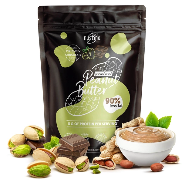 • Nustino Pistachio & Chocolate - це високобілковий, нежирний порошок арахісового масла. Поєднання какао та ароматної фісташки - без додавання цукру. Ідеально підходить для дієтичних десертів, смузі та здорових сніданків!