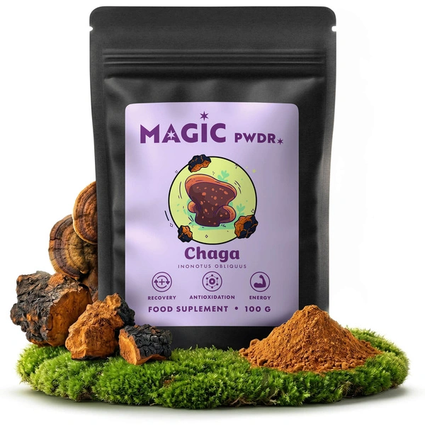 Чага (Inonotus obliquus) - деревовидний гриб, що росте на деревах і використовується в традиційних дієтичних системах північних країн. У Magic Pwdr Chaga використаний концентрований екстракт з плодових тіл 10:1, що означає високу концентрацію сировини в кожній порції порошку.
