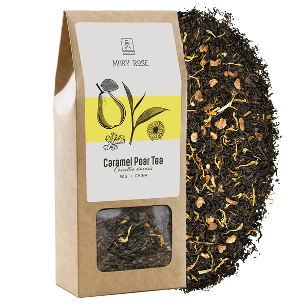 • Mary Rose Caramel Pear - чайна композиція, ідеальна для довгих осінніх вечорів. Солодко-пряне поєднання чорного юньнаньського чаю, груші, імбиру та натурального карамельного аромату.
